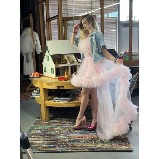 View full detailsThis enchanting dress captures the essence of ethereal beauty with its voluminous ruffled tulle and captivating high-low silhouette. The soft pink ...