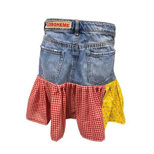 View full detailsCrafted with care and imagination, this unique skirt combines pre-loved GAP denim with cheerful red gingham and sunny yellow floral fabric. A livel...