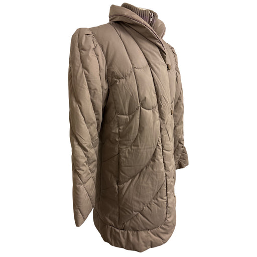 A classic vintage coat from Ms. Freddi, combining a quilted design, puff shoulders, and a cozy knit collar. A timeless piece with charming details....