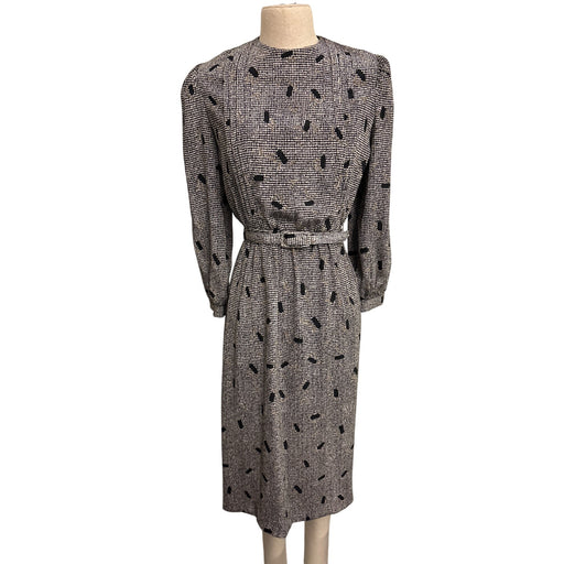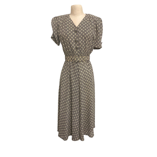This vintage Leslie Fay dress embodies timeless elegance with its geometric floral pattern, tailored belt, and classic silhouette. Perfect for evok...
