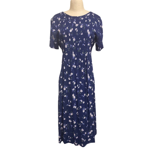 This charming vintage navy midi dress showcases delicate floral patterns, pleated details, and a tie-back design, evoking timeless elegance for a c...