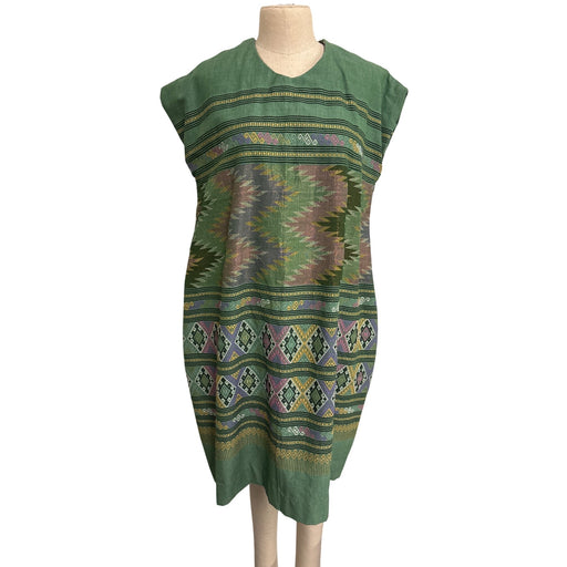 Green Handmade Vintage Handwoven Ethnic Tunic Dress With Geometric Patterns & Sleeveless Design