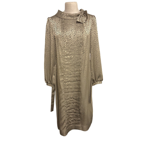Vintage 1970s Beige Zebra Print Satin Sheath Dress Bow Detail Belted Waist Fundraiser for Sustainable Fashion Education Programs