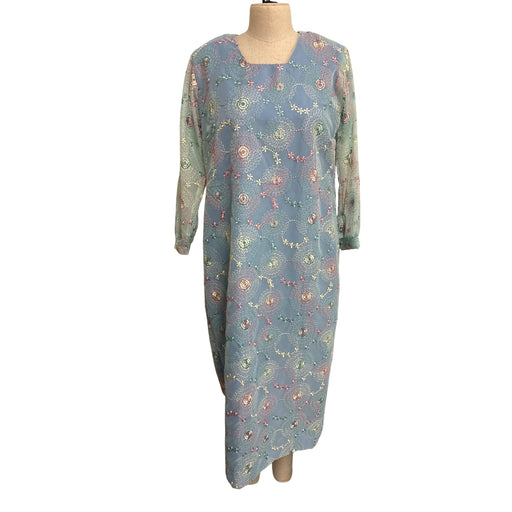 Vintage Pastel Floral Embroidered Sheer Long Sleeve Midi Dress Boho Style, Fundraiser for Sustainable Fashion Education Program