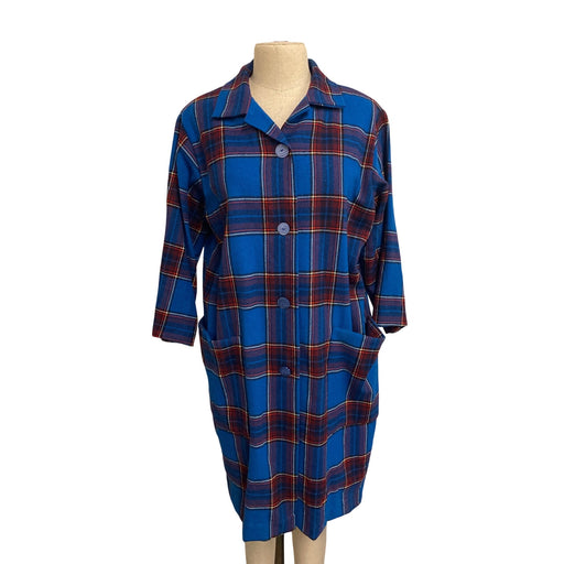 Vintage Handmade Blue and Red Plaid Button-Up Oversized Shirt Dress With Pockets 3/4 Sleeves