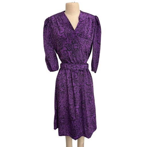 This vintage dress presents an elegant floral design in bold purple and black tones. Its tailored fit, puff sleeves, and belted waist offer timeles...