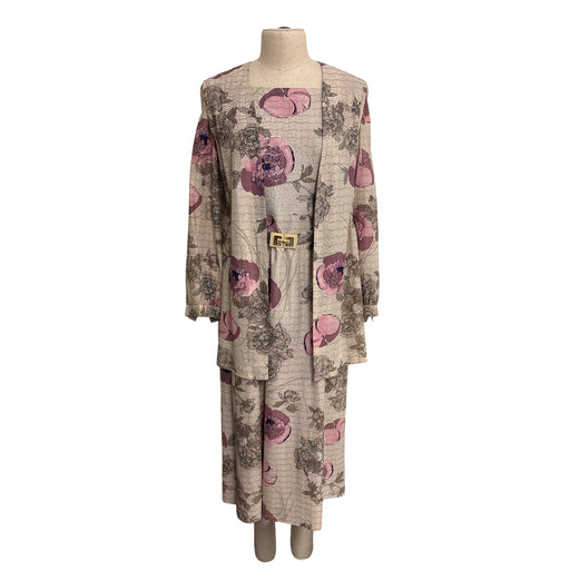 Vintage Handmade Floral Two-Piece Dress and Jacket Set With Gold-Tone Buckle Belt Pink Beige Floral Pattern Fundraiser Sustainable Fashion