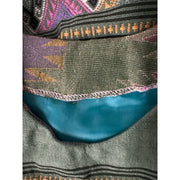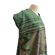 This vintage handwoven tunic dress emanates cultural artistry with intricate geometric patterns. The soft green tones and sleeveless cut evoke timeless elegance.