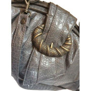 Great gray satchel handbag made of faux leather simulating snakeskin in solid gray color with big brass colored buckle detailing by the vintage label "Rivage". It has one large main compartment and one slice inner zipper pocket. The vinyl lining is also gray.