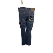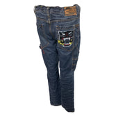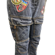 These cargo jeans showcase a statement with their unique embroidered patches and vintage Americana style. The denim material ensures durability, while the multiple pockets provide practicality for everyday use. Ideal for a bold, casual look, these jeans are versatile and comfortable.