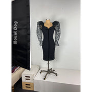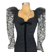 Own a definitive piece of American eveningwear history with this rare Climax by Karen Okada for David Howard little black dress. This iconic garment features theatrical, sheer puff sleeves with intricate swirl embroidery, perfectly capturing the high-octane glamour of late-century cocktail attire.
