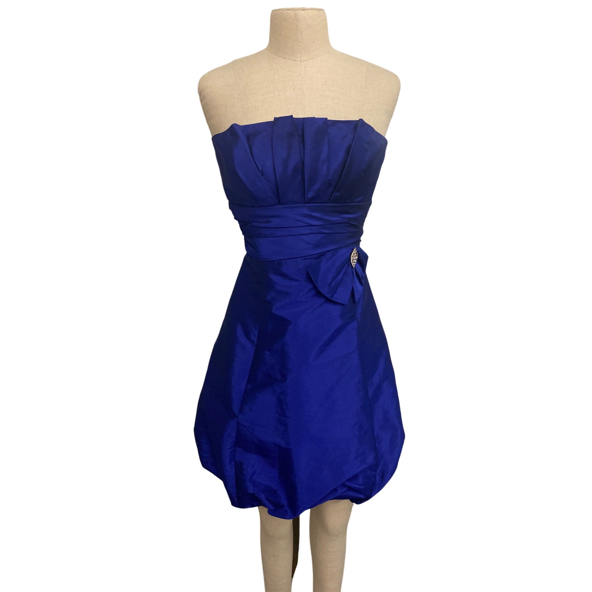 Betsy and Adam by Linda Bernell Strapless Royal Blue Satin Dress With Rhinestone Bow Detail & Bubble Hem
