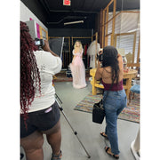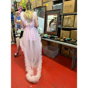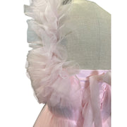 This enchanting dress captures the essence of ethereal beauty with its voluminous ruffled tulle and captivating high-low silhouette. The soft pink hue adds a dreamy quality, while the flowing train creates a dramatic, yet elegant presence. Meticulously crafted, this dress embodies romance and sophistication, ensuring you leave a lasting impression with every step.