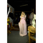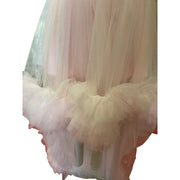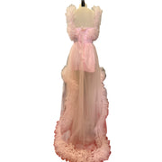 This enchanting dress captures the essence of ethereal beauty with its voluminous ruffled tulle and captivating high-low silhouette. The soft pink hue adds a dreamy quality, while the flowing train creates a dramatic, yet elegant presence. Meticulously crafted, this dress embodies romance and sophistication, ensuring you leave a lasting impression with every step.