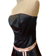 This elegant strapless dress features a sophisticated combination of black and pink satin, elegantly tailored to accentuate the silhouette. The bow detail at the waist adds a touch of charm and refinement, while the flared skirt provides graceful movement. Its sleek lines and classic color palette make it a timeless addition to any wardrobe.