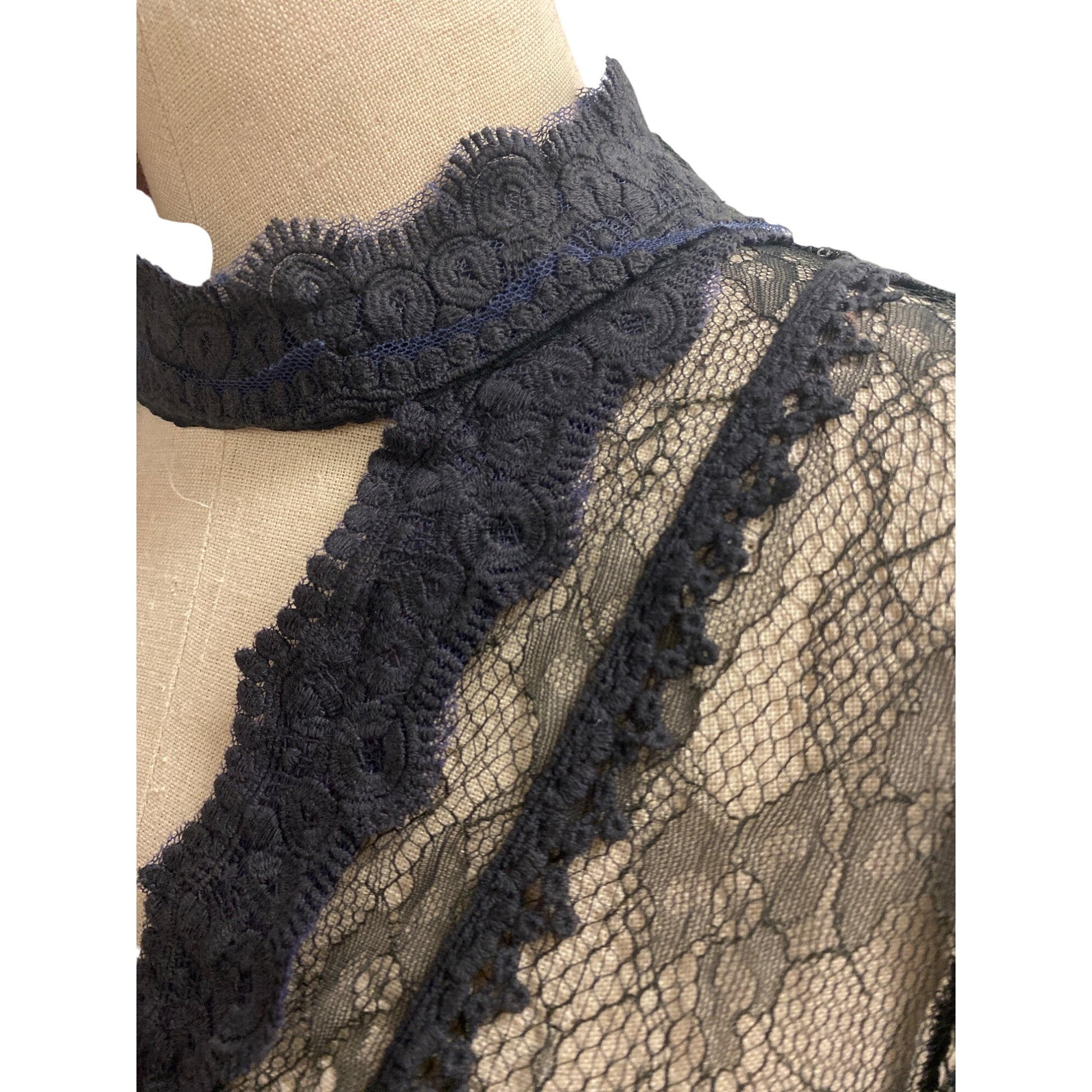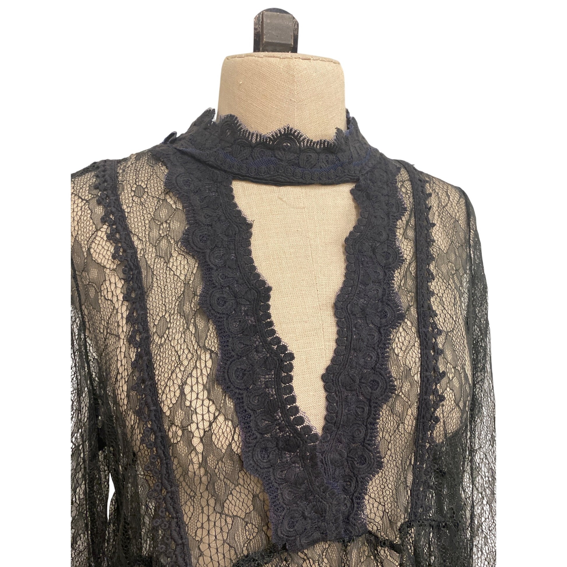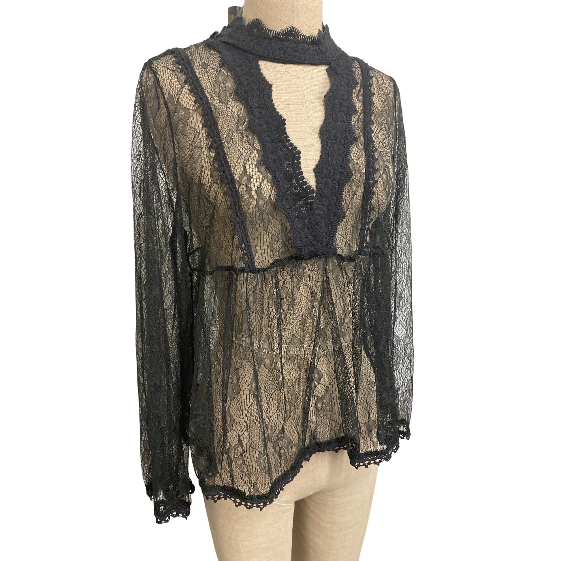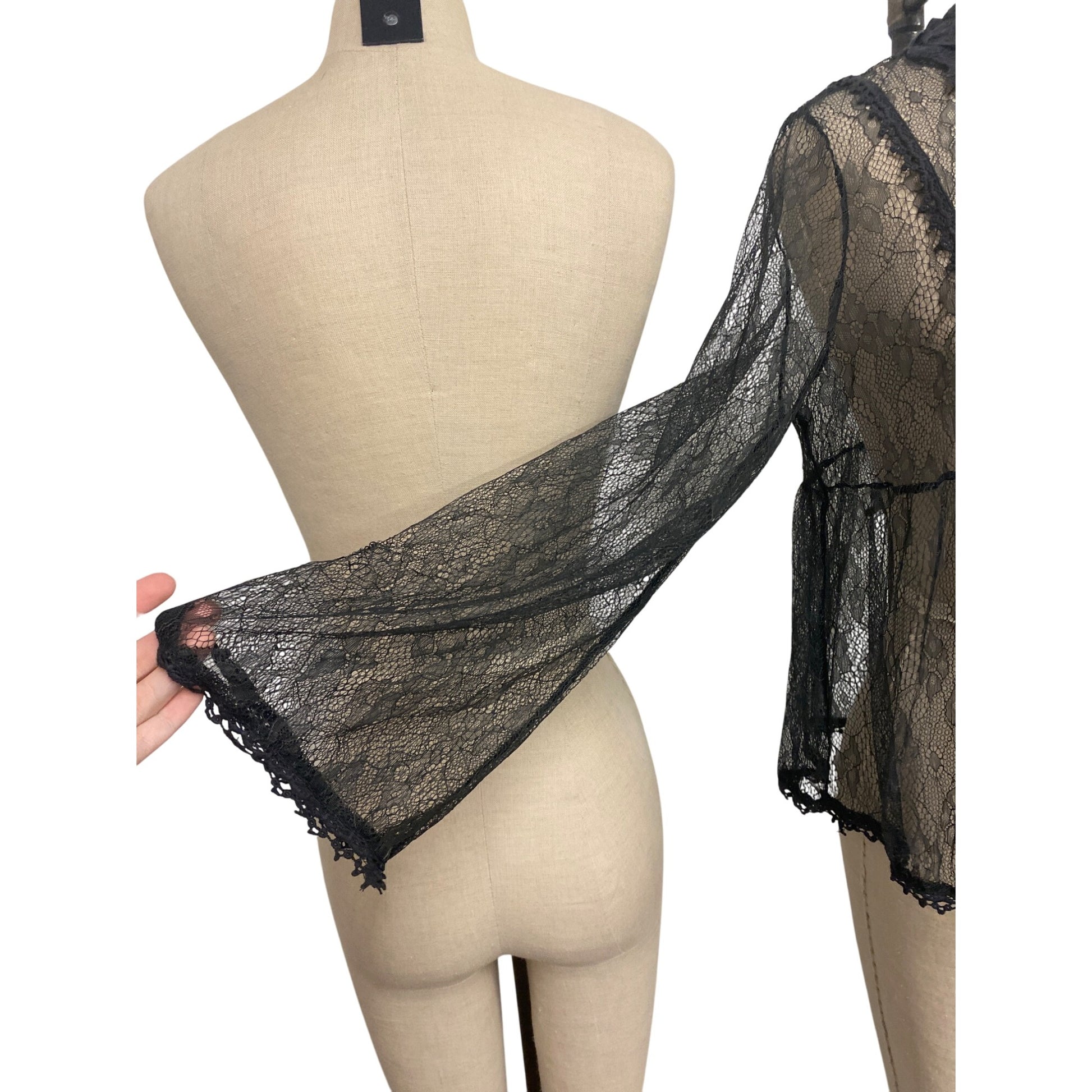Altar’d State Black Lace Bell Sleeve Top With Scalloped Trim & Keyhole Neck