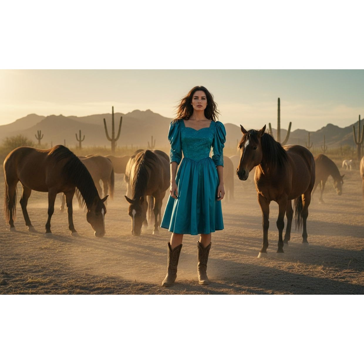 A rare Lauren Balog treasure, this turquoise dream isn’t just a dress—it’s a statement. With its puffed sleeves, lace-detailed bodice, and luminous satin flow, it carries the soul of another era while speaking boldly to the present. Think timeless romance with a wild spirit: the kind of piece you wear to step off the page of a vintage Vogue spread and into your own story—whether that’s striding through desert dust, galloping alongside horses, or simply savoring a moment of intentional beauty.