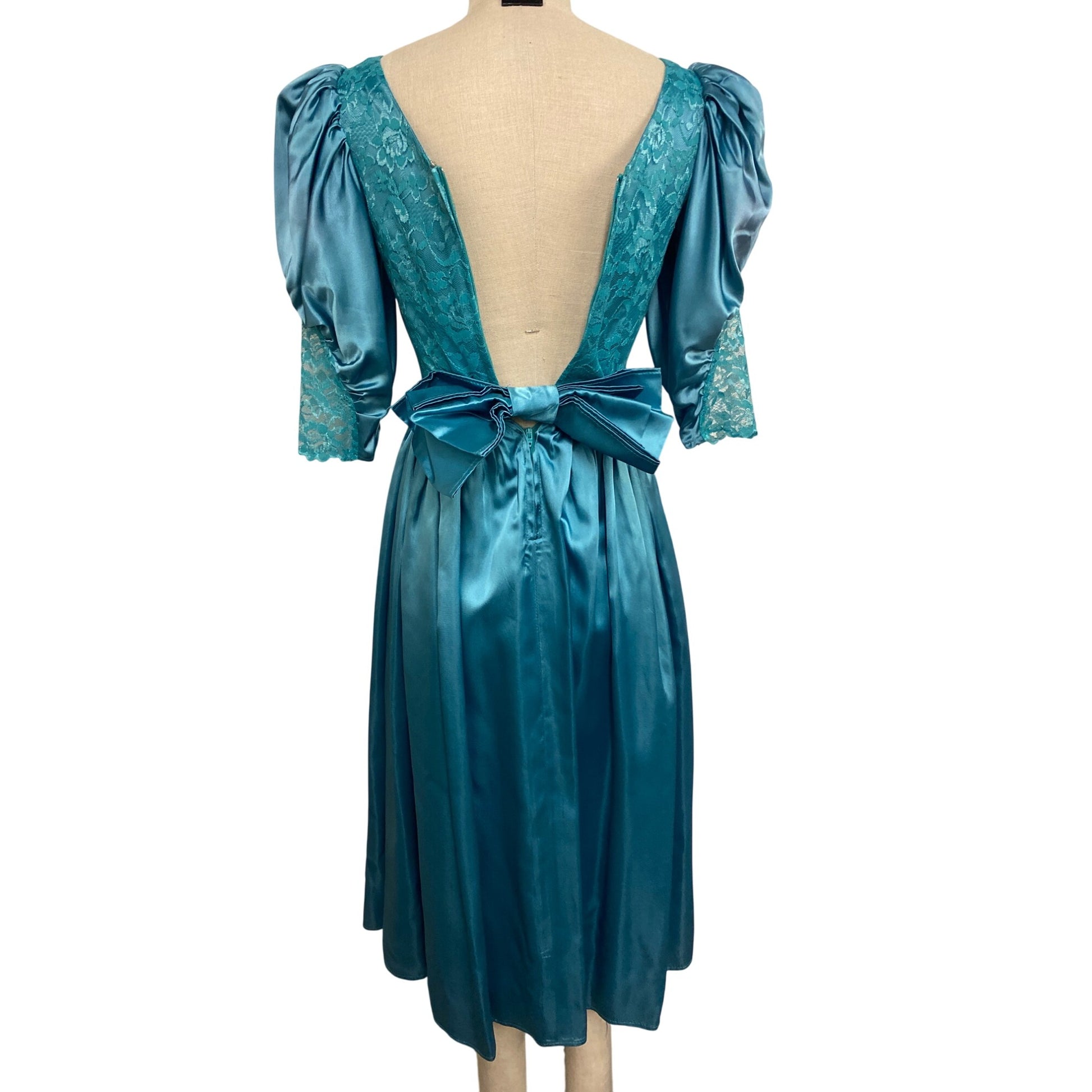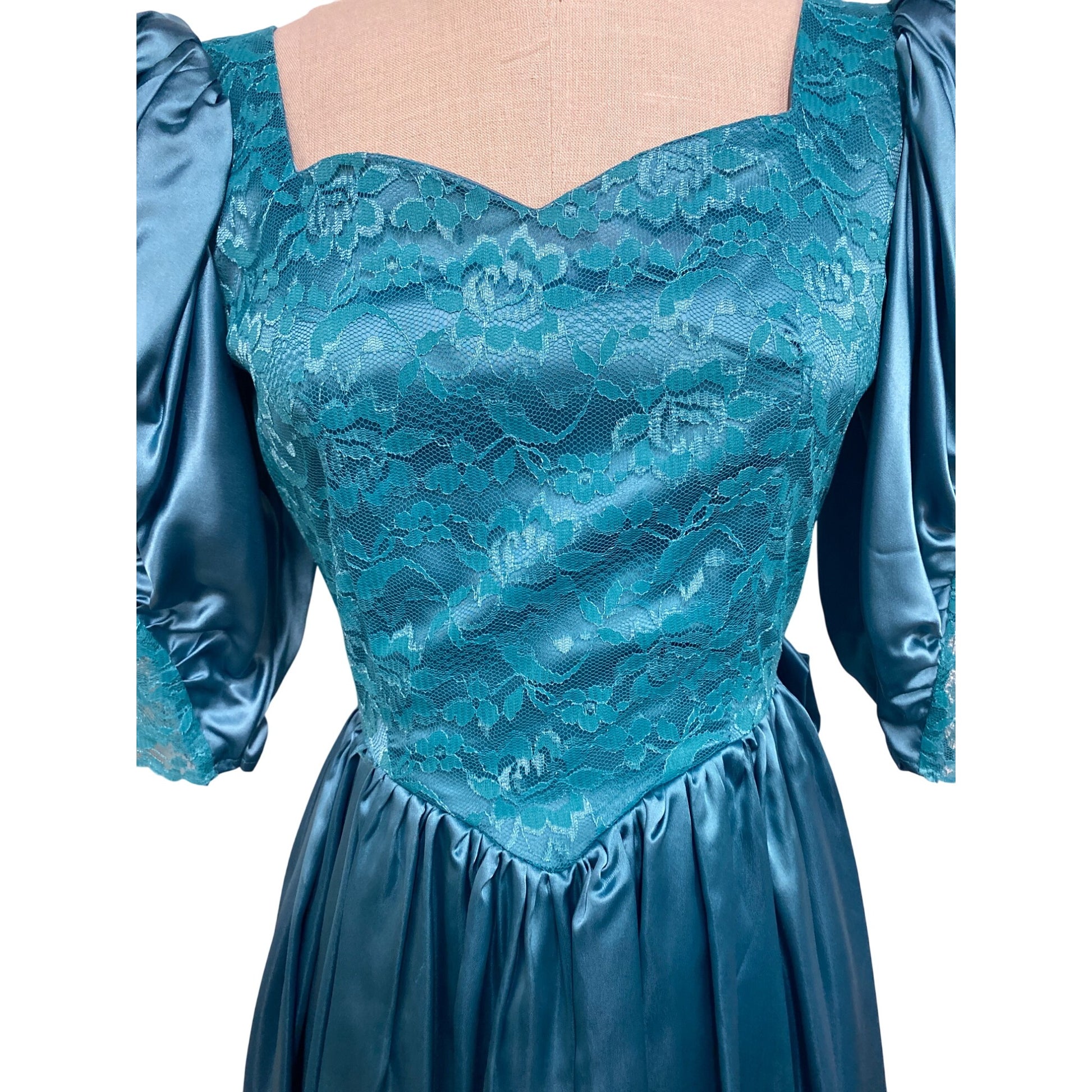 An Original by Lauren Balog Vintage Turquoise Lace & Satin Puff Sleeve Dress