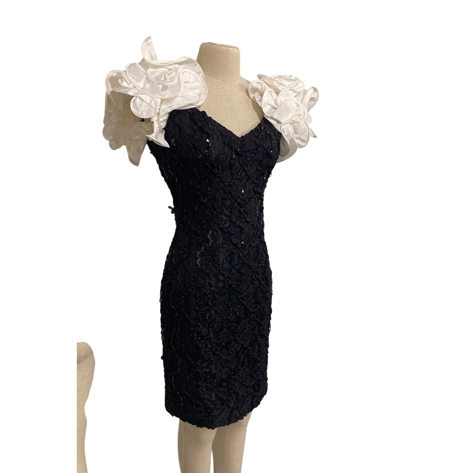 This exquisite dress by Susan Roselli for VI Jack blends classic elegance with contemporary flair. The black lace body offers a sophisticated look, while the striking white satin ruffle shoulder detail adds a modern touch. Ideal for evening events, this dress is both unique and stylish.