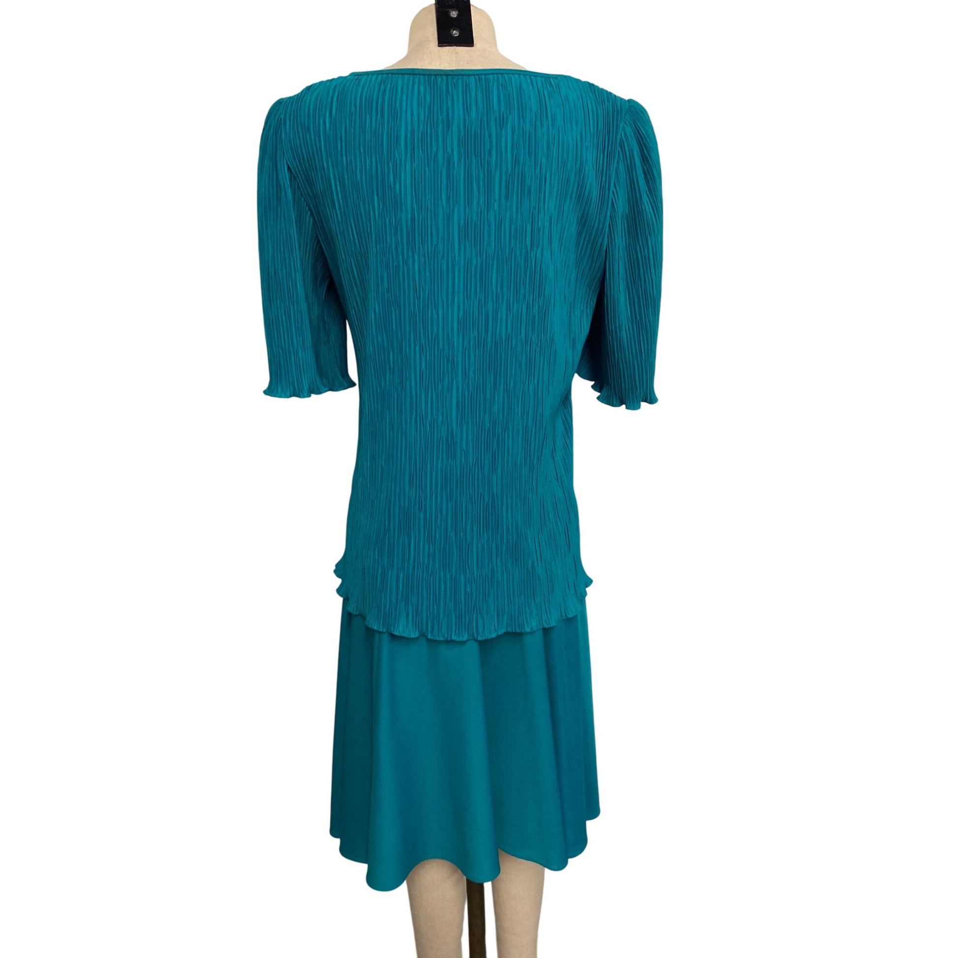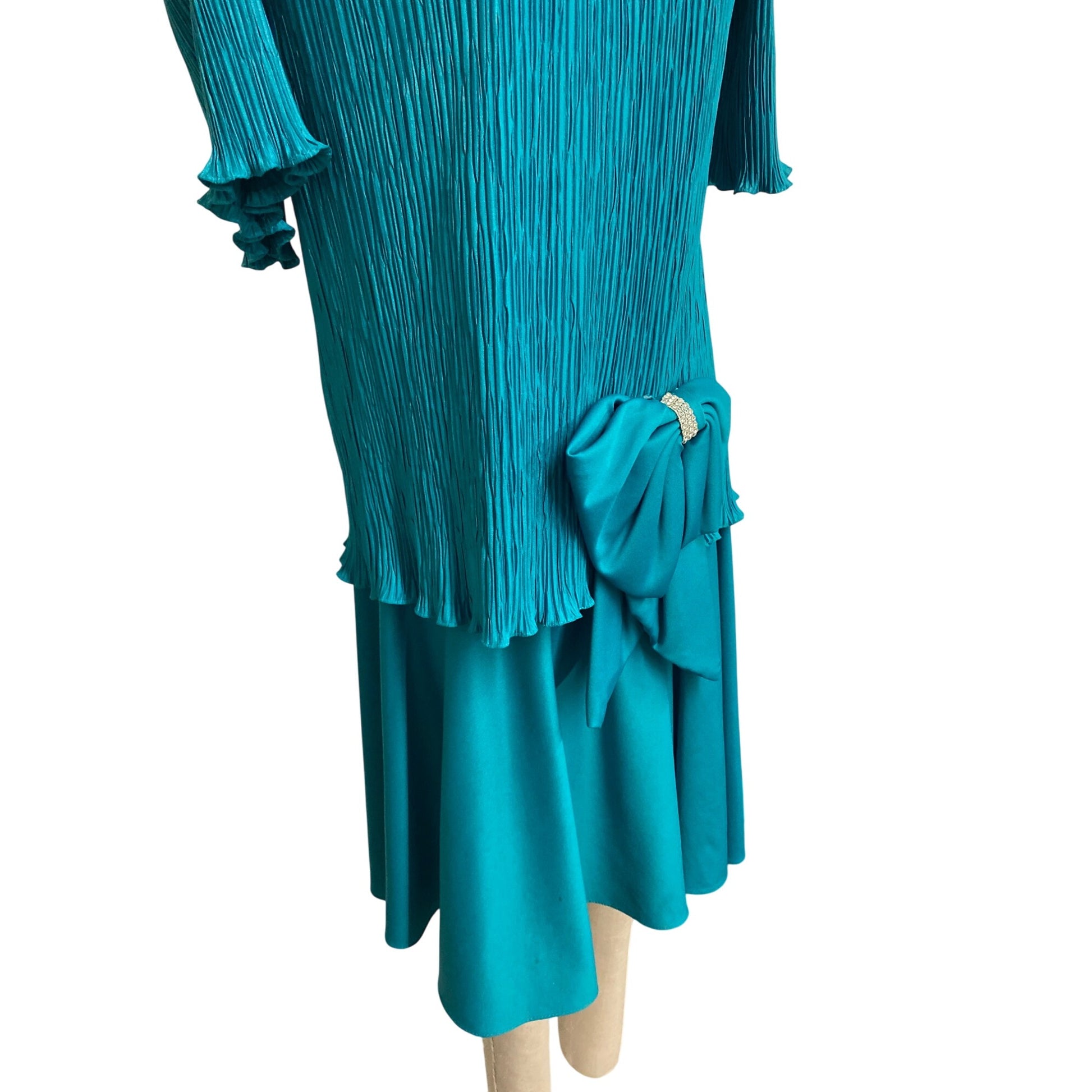 Vintage After Dark Teal Green Pleated Dress With Bow Accent & Rhinestone Detail Retro