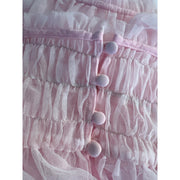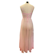 Embrace the ethereal elegance of this vintage pink nightgown, crafted with delicate sheer fabric. The ruched waist and button detailing add an exquisite touch to its flowing silhouette. The soft pink hue exudes a romantic charm, making it a timeless piece for those who appreciate classic, feminine style. Its lightness and gracefulness make it an ideal choice for warm summer evenings or as a luxurious loungewear piece. Revel in its gentle embrace and enjoy the sophistication it brings to your wardrobe.
