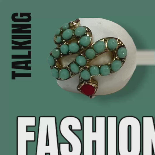 Fabulous ring in seamless white plastic domed base with elevated figural snake design in mint green and red rhinestones over the golden finishing.