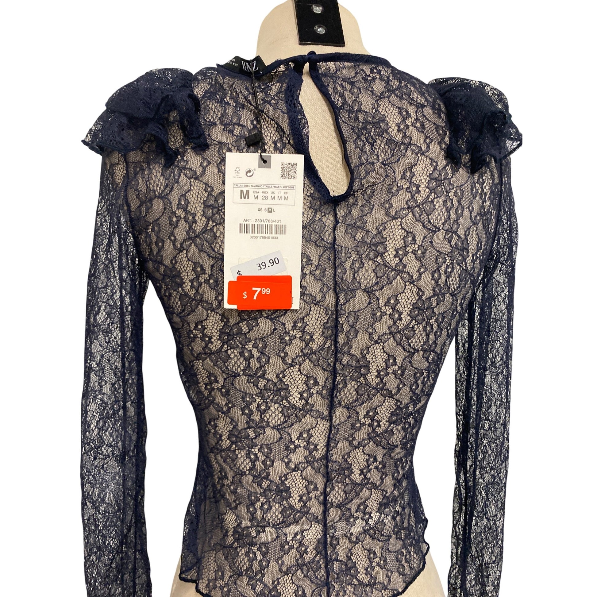 With its intricate lacework and elegant ruffles, this Zara blouse offers a sophisticated look. Ideal for layering or wearing on its own, the see-through design adds a hint of allure. The navy hue complements various outfits, making it a versatile piece for any wardrobe.